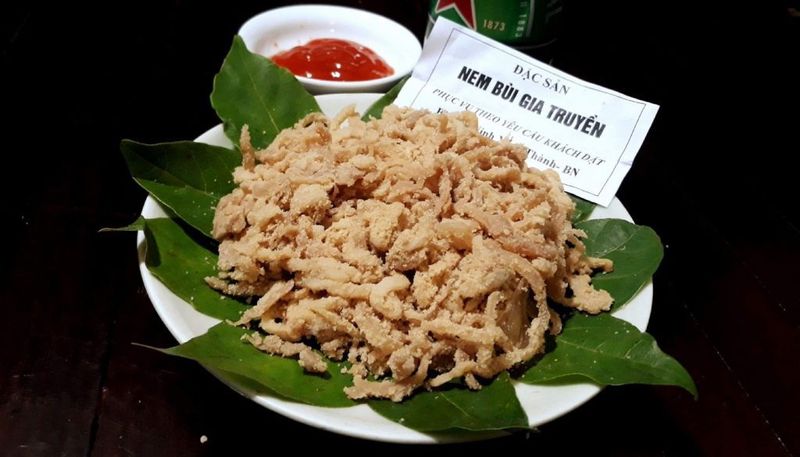 Natif du village de Bui, c'est le roi de l'apéro du coin. C'est du porc fermenté haché finement, mélangé à de la poudre de riz grillé (Thinh) qui lui apporte une texture croustillante et un parfum de noisette.