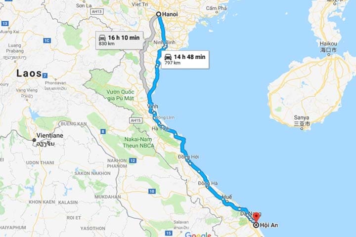 - Hanoi – Hue : 700 km, 12–14 heures.