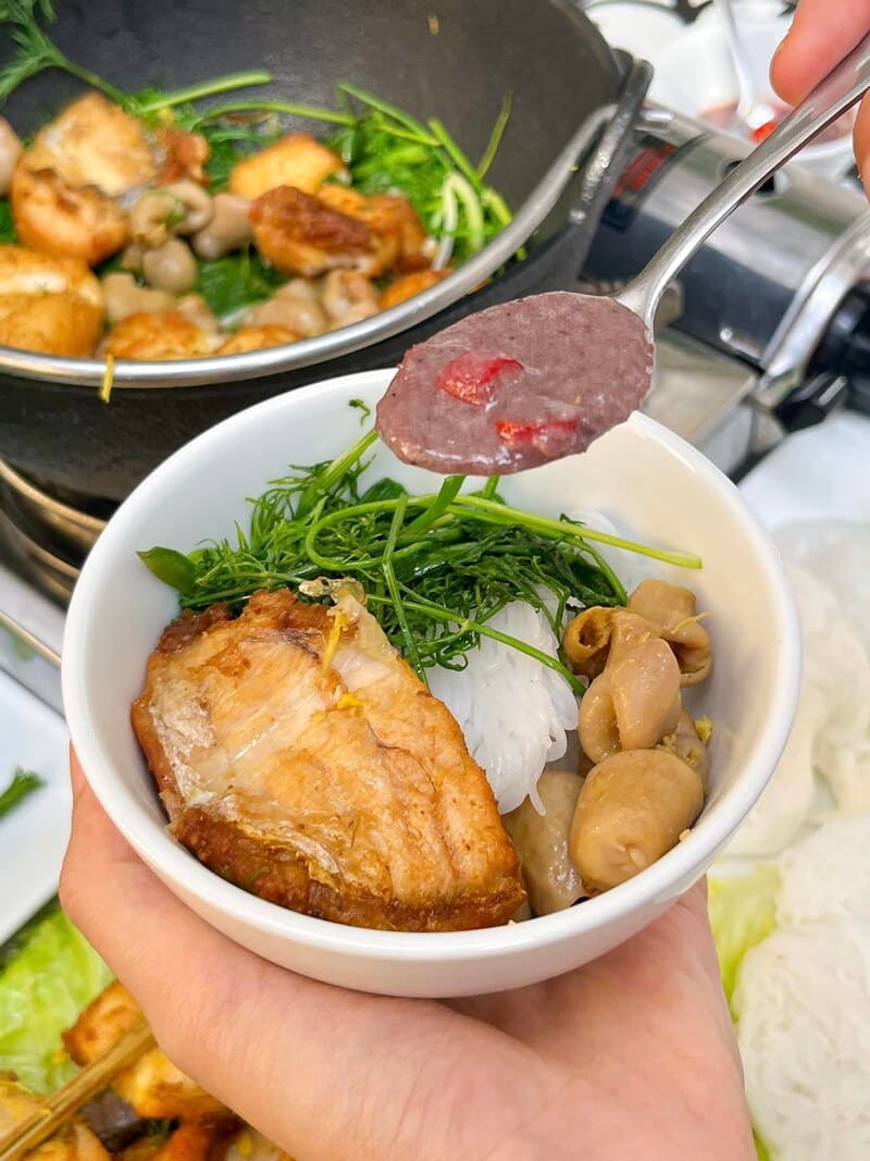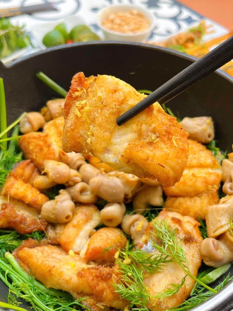 Manger du Chả Cá, c’est un spectacle. Le serveur pose sur la table une poêle en fonte brûlante où mijotent les morceaux de poisson grillé. Le feu crépite, l’aneth grésille, et l’air s’emplit d’un parfum envoûtant.