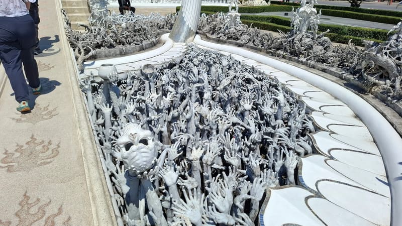 Avant d’accéder au temple principal, on traverse un pont étroit entouré de centaines de mains blanches tendues vers le ciel. L’ensemble évoque l’enfer et les tentations de la vie humaine, qu’il faut dépasser pour atteindre l’illumination. Certains visiteurs comparent cette traversée à une expérience quasi psychédélique : les sculptures de visages et de mains semblent se mêler en une masse troublante qui accentue la sensation de quitter le monde terrestre.
