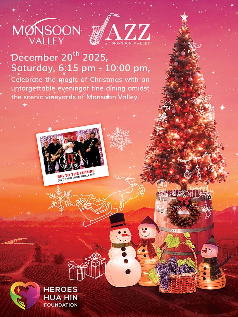 En particulier, vous pourrez déguster les vins exquis de Monsoon Valley tout en profitant de l’atmosphère romantique du vignoble. N’oubliez pas de participer à l’événement caritatif Hua Hin Heroes le 20 décembre 2025 pour partager de la joie et soutenir la communauté.
