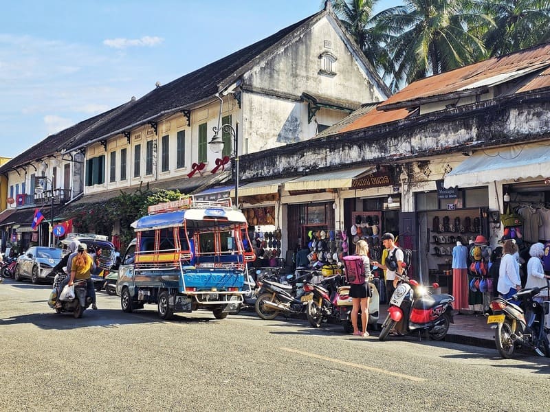Train matinal vers Luang Prabang. Depuis la gare, taxi via Loca ou minibus partagé pour rejoindre le centre. Ancienne capitale royale, la ville mêle temples laotiens et maisons d’inspiration française. En soirée, le marché de nuit anime l’axe principal avec artisanat et spécialités locales.