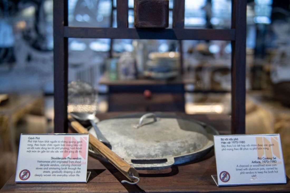 Parmi les vitrines, on découvre des marmites anciennes, des mortiers en pierre, des épices brutes, mais aussi des pages de dictionnaires où apparaît pour la première fois le mot « phở ». Plus de 200 pièces sont présentées, accompagnées d’archives et de documents retraçant la diversité du phở dans les trois régions du Vietnam.