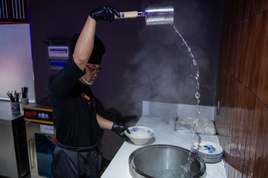Dans un espace immersif, entouré de grands écrans, les visiteurs dégustent un bol de phở dans une ambiance enveloppante, presque cinématographique. La cuisine est entièrement ouverte, permettant d’observer chaque geste, du service du bouillon à la présentation finale. L’équipe travaille avec des gants et dans des conditions d’hygiène strictes.
