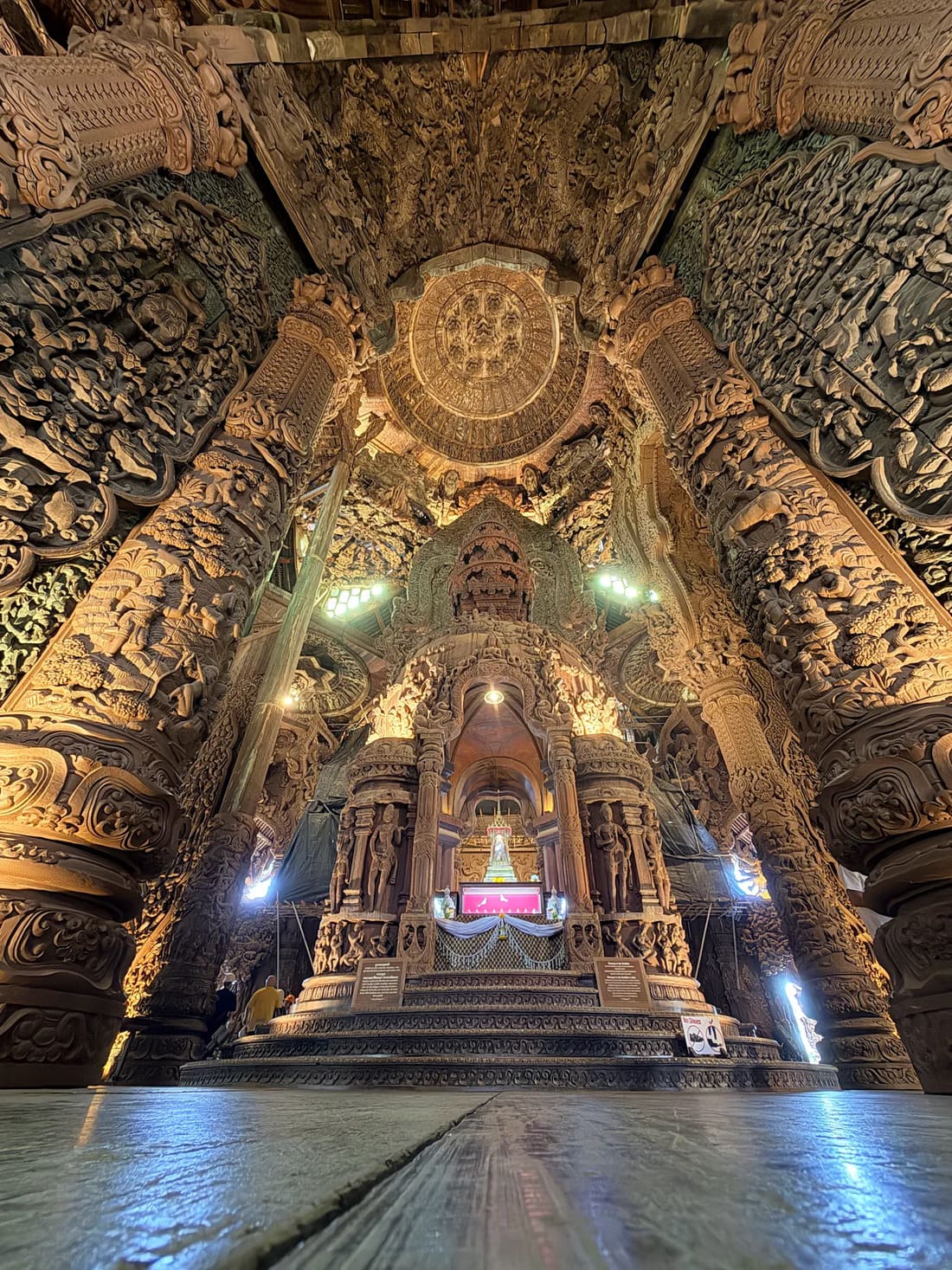 Le Sanctuaire de la Vérité est le plus grand édifice en bois au monde construit sans clous métalliques. Chaque partie du bâtiment est sculptée à la main selon les techniques artisanales traditionnelles thaïlandaises. La construction a commencé en 1981 sous l’impulsion de Khun Lek Viriyaphan, passionné d’histoire et de philosophie, qui souhaitait transmettre aux générations futures un héritage culturel universel.