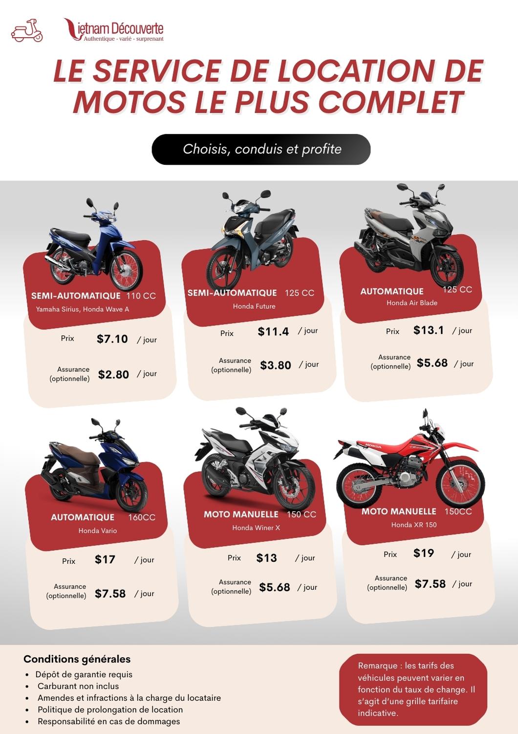 L’agence accepte les locations en aller simple, avec la possibilité de récupérer la moto à Saigon et de la rendre à Huê, Da Nang ou même Hanoï. La flotte se compose exclusivement de Honda et Yamaha révisées toutes les 1 500 km pour garantir confort et sécurité. L’atelier est dirigé par un mécanicien fort de plus de vingt ans d’expérience, particulièrement apprécié des expatriés et des voyageurs au long cours pour son professionnalisme