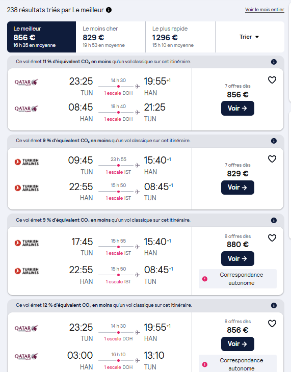 - Vol aller : Tunis (TUN) → Hanoï (HAN)