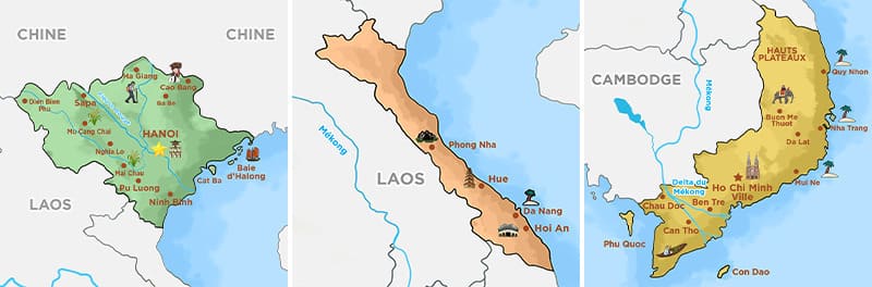- Hanoï (HAN) : La capitale, située au Nord. Idéal pour commencer votre voyage par la vieille ville, la Baie d'Halong, Sapa ou Ninh Binh.