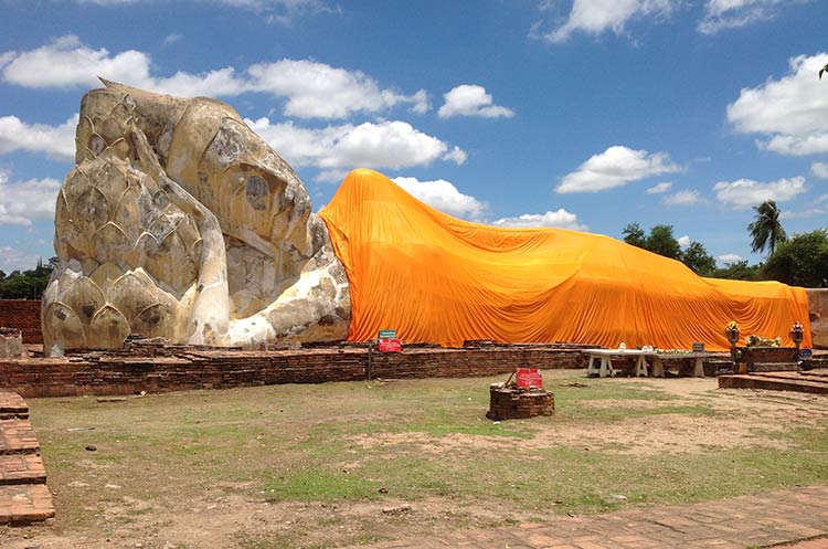 Situé dans le quartier de Pratoochai derrière l’ancien Palais, le Wat Lokayasutharam n’est pas un temple à proprement parler, mais une très grande statue du Bouddha couché au sol. Elle est impressionnante avec ses 37m de long et ses 8m de haut, construite en brique et ciment. La tête du Bouddha repose sur une fleur de lotus, ce qui donne à l’ensemble une sensation de calme très agréable.