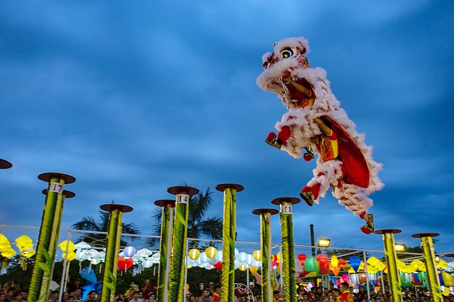 - Ambiance : Les rues s’illuminent de lanternes, les troupes de danse du lion défilent dans les quartiers résidentiels