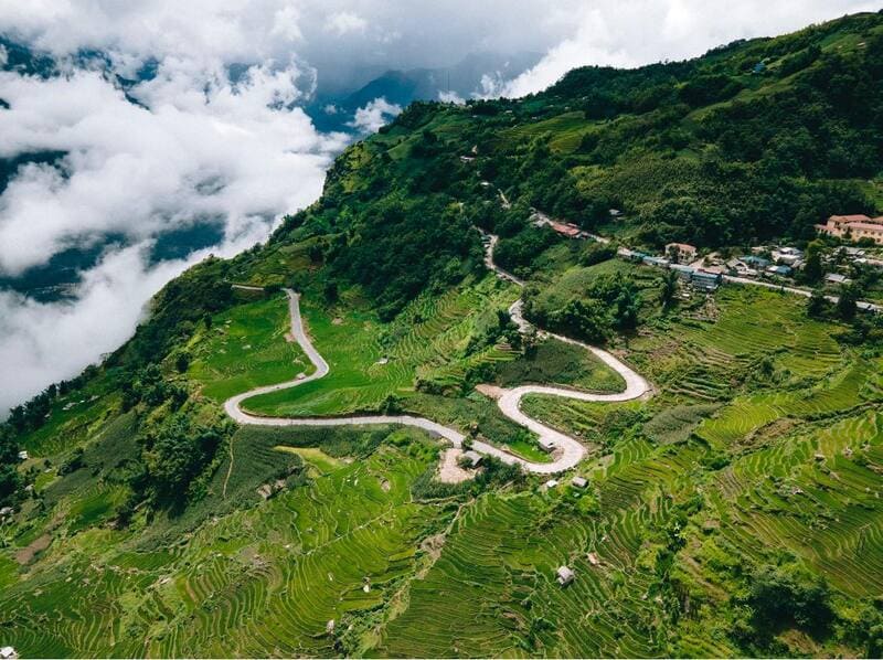 Rizières en terrasses, routes sinueuses et sommets brumeux.