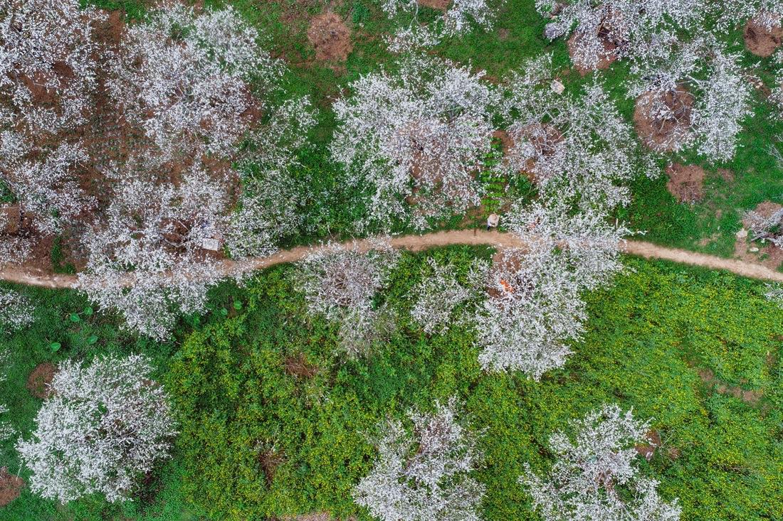 Vu d'en haut, les vergers de pruniers en fleurs recouvrent les collines d'une vaste étendue blanche.
