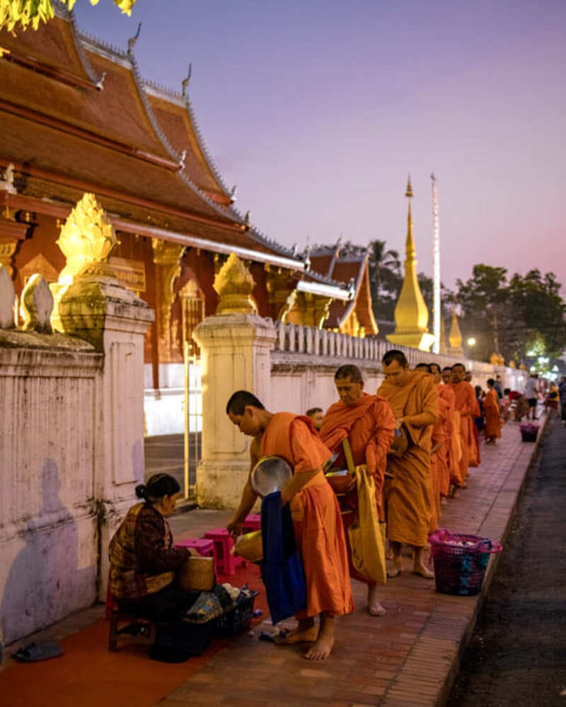 Au lever du jour, observer la cérémonie d’aumône des moines, en restant à distance, dans le silence et sans flash. Ensuite, visite de temples, musées ou pause dans un café face au Mékong, simplement pour regarder le fleuve s’écouler lentement.