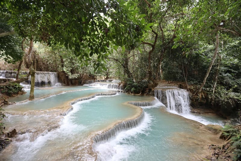 Départ matinal vers les chutes de Kuang Si, idéalement dès l’ouverture vers 8 h afin d’éviter l’affluence. Les bassins turquoise se déploient en terrasses successives, et certaines zones sont ouvertes à la baignade.