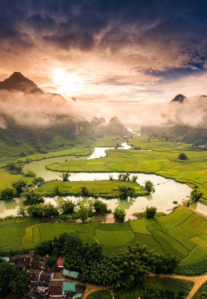 Ici, pas de grands hôtels ni de bus touristiques. Le spectacle est offert par la nature elle-même : un tapis de rizières dorées ou miroitantes selon la saison, encadré par des montagnes karstiques aux formes spectaculaires qui rappellent la baie d'Halong terrestre.