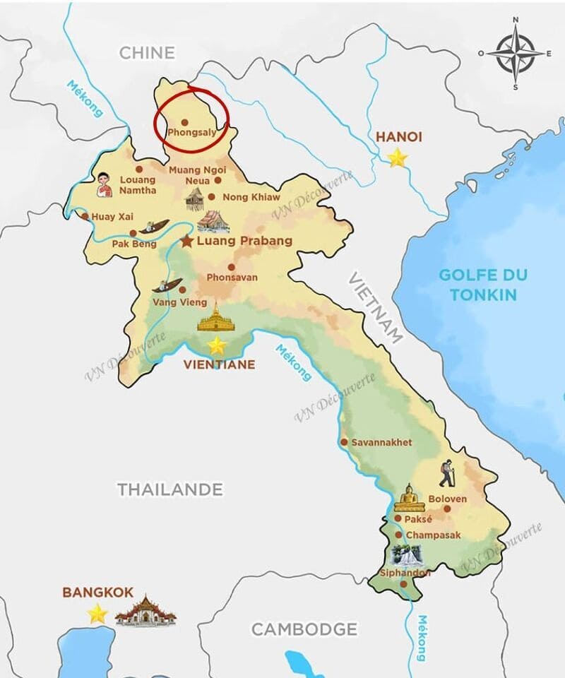 Si vous regardez une carte du Laos, Phongsaly, c'est cette pointe tout au nord qui s'échappe du pays. À l'extrême nord, la province constitue une sorte de péninsule terrestre enclavée, bordée sur trois côtés par deux géants : la province du Yunnan (Chine) à l'ouest et au nord, et la province de Dien Bien (Vietnam) à l'est.