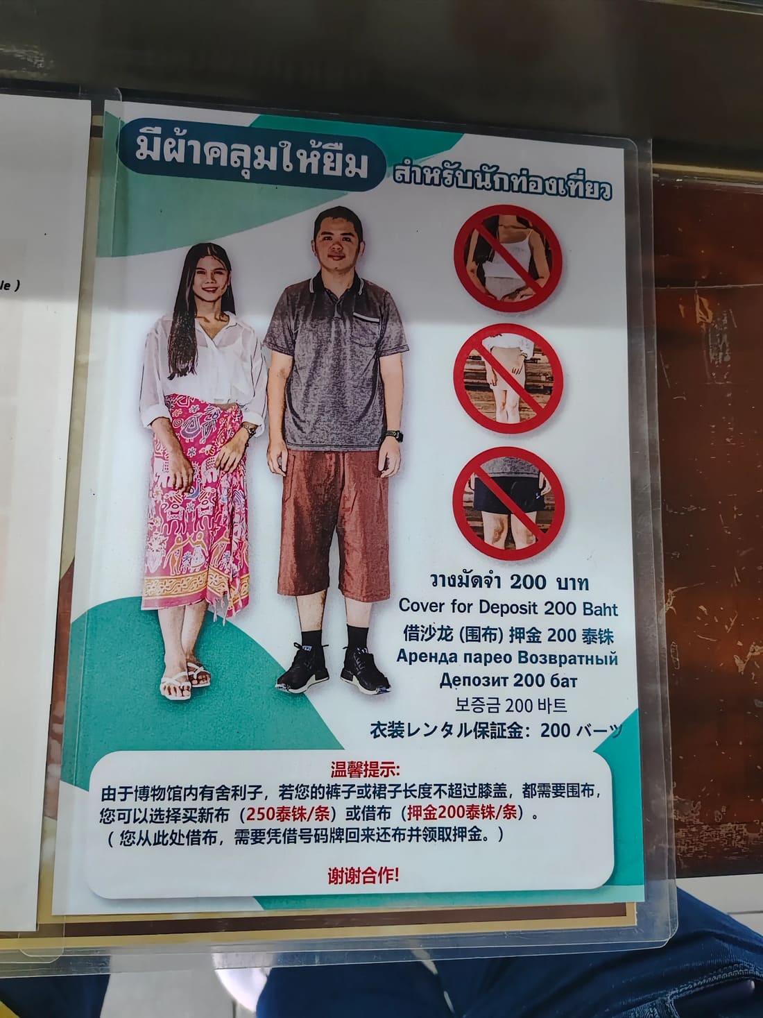 Un service de prêt de tissu est proposé à l’entrée contre une caution de 200 bahts, remboursée lors du retour. Il est également possible d’acheter un tissu neuf pour environ 250 bahts. Pensez à conserver le ticket ou le jeton remis lors du dépôt pour récupérer votre caution.