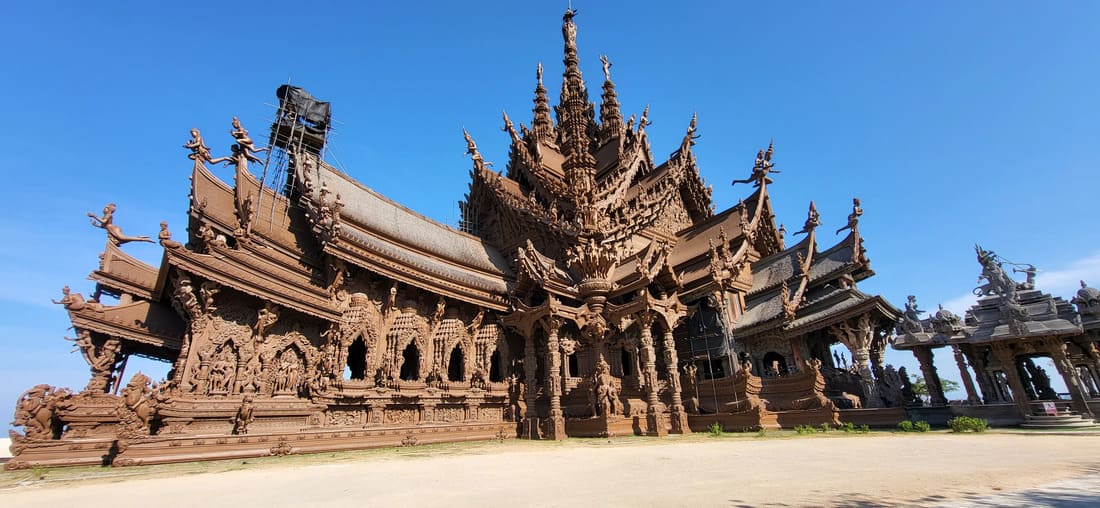 Le Sanctuaire de la Vérité est le plus grand édifice en bois au monde construit sans clous métalliques. Chaque partie du bâtiment est sculptée à la main selon les techniques artisanales traditionnelles thaïlandaises. La construction a commencé en 1981 sous l’impulsion de Khun Lek Viriyaphan, passionné d’histoire et de philosophie, qui souhaitait transmettre aux générations futures un héritage culturel universel.