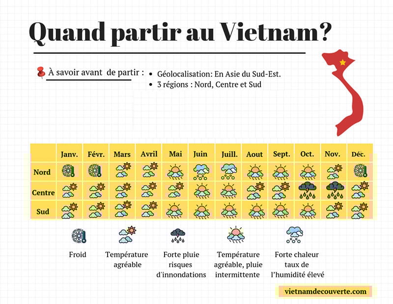 Grâce à sa forme tout en longueur (plus de 1600 km du Nord au Sud), le Vietnam connaît une grande diversité de climats. Il n'y a pas de "mauvaise" saison, mais la météo varie fortement d'une région à l'autre.