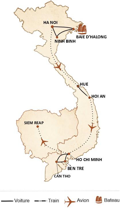 Souhaiteriez-vous découvrir le Vietnam et le Cambodge tout en séjournant dans des hôtels de charme offrant des prestations haut de gamme ? Nous avons sélectionné les meilleures adresses pour vous garantir une expérience inoubliable : des hôtels élégants à Hanoï, au cœur du vieux quartier, des croisières de charme sur la stupéfiante Baie d'Halong, et des séjours royaux dans l'historique Hue ainsi que dans la vieille ville de Hoi An. Profitez également de moments dynamiques dans la plus grande ville du Vietnam, Ho Chi Minh-Ville. Concluez votre voyage par la découverte des temples majestueux d'Angkor à Siem Reap, au Cambodge. Chaque étape de ce voyage est méticuleusement organisée pour vous offrir une expérience luxueuse, exclusive et mémorable.
